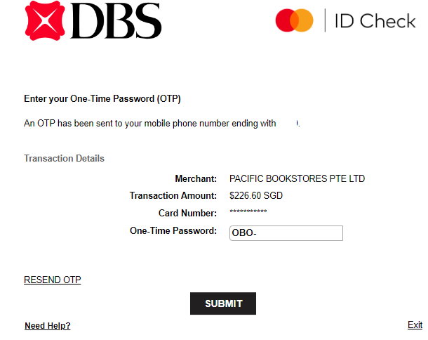Authorise the payment wih the One-Time Password (OTP) provided by your bank.